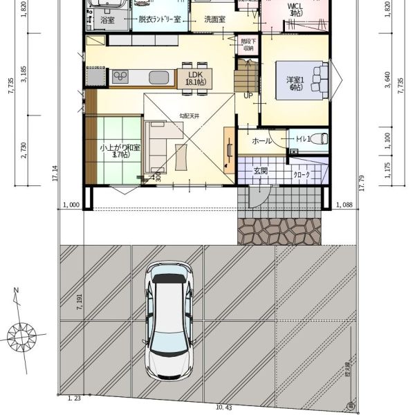 | 設備サービス | 勾配天井、小上がり和室、全居室収納、ウォークインクローゼット、クローゼット、シューズクローク、床下収納、モニター付インターホン、ディンプルキー、ダブルロックドア、浄化槽、省エネ給湯器、フローリング、クッションフロア、上水道、電気、側溝、人感センサー付照明、ダウンライト、照明器具、火災警報器(報知機)、複層ガラス |