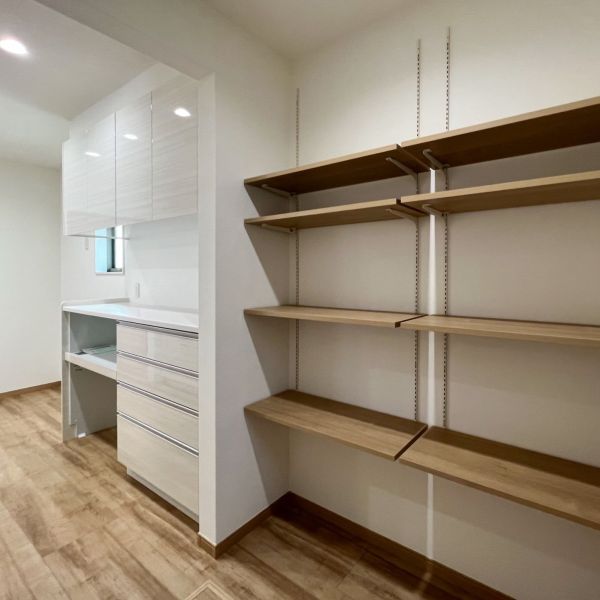 ホワイトを基本色とし、金属部分をアクセントでグレーを採用したシンプルな和モダンの外観。ダークブラウンの玄関ドアを採用することで、外壁とのコントラストが映えるファサードとなるよう構成されています。フローリングとドアの色をテイストの近い木目にすることで、よりナチュラルな自然の温かみを感じるリラックスした雰囲気のインテリアに仕上げました。キッチン収納横にはパントリーがあり、可動棚を採用することで高さがあるものも収納できる空間となっています。和室の仏間下には収納があり、機能性も兼ね備えた和風の空間へと仕上がっています。水廻りのアクセントに、光沢のあるブラックを採用することでナチュラルになりすぎない空間へと構成されています。