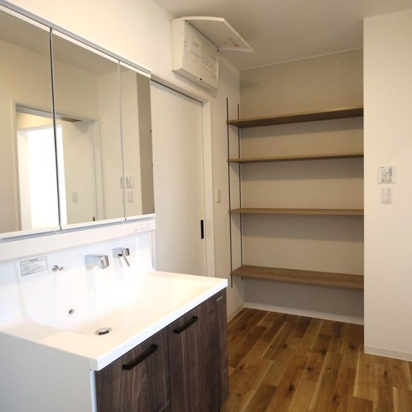 緑色の洋風瓦を採用した外観は北欧テイストを取り入れたスタイルです。可愛らしくなりすぎないようにサッシを黒にしています。板チョコのような色味と形状の玄関ドアは洋風の外観と相性が良いのでオススメです。玄関ホールにはホワイトウッドのクロスで猫の足跡がデザインされたクロスを採用しました。遊び心があり、家族とお客様をほっこりさせる仕様です。モスグリーンが印象的なLDKはタタミスペース一体型で広くリビングをレイアウトする事ができます。キッチン奥から洗面室に通じる家事通路があり、家事負担を減らせる間取りです。洗面室は3帖スペースとは別に可動棚収納があるので、タオルや着替えをしっかり収納しても脱衣室として広々使うことが出来ます。
