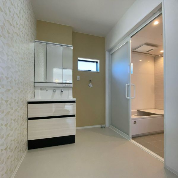 ベースをグレー、アクセントにホワイトの外壁を使用したシンプルモダンな外観です。玄関上部は下屋ではなく、フラットルーフにすることでスタイリッシュな外観になっています。内装は明るいナチュラルな雰囲気で、落ち着いた色合いになっています。リビング上部を高天井にすることで奥行き感がでて、部屋が広く感じられます。LDKに隣接した和室はキッチン横にあるので家事をしながら子供の様子が見られる部屋になっています。リビング横に勝手口を設置することでキッチンやリビングを横切らずにゴミ捨てなどが出来ます。寝室にはインナーバルコニーが隣接しているので雨の日でも洗濯物が干すことが出来ます。
