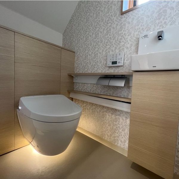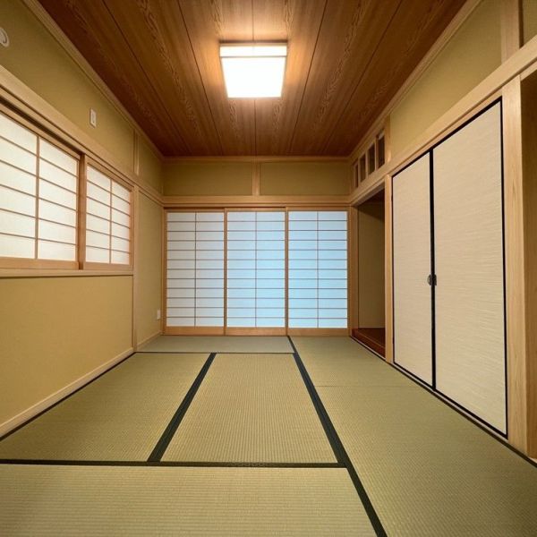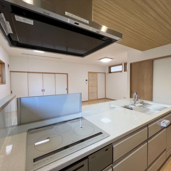 真壁和室を採用した純和風のお家です。床の間・神棚も職人の技術が光る一品です。日本の古き良きを現代に再現した美しい空間に仕上がりました。LDKにも和風を取り入れ落ち着いた雰囲気です。アイランドスタイルのシステムキッチンは家事の中心となる立ち位置でダイニング・リビングを一望できる間取りとなっています。水回りにも近く、勝手口から出入りできる納戸兼パントリーをキッチン後ろに配置することでお買い物帰りもすぐに荷物を搬入することが出来ます。こだわった水回りの設備は使いやすさとインテリア性を兼ね備えたスタイルで、何気ない日常を豊かにしてくれます。